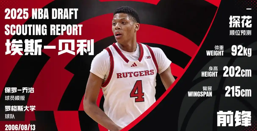 埃斯-贝利是一个身高202公分的前锋,臂展达到了215公分,天赋异禀。在今年为罗格斯大学出战的30场比赛里,埃斯-贝利场景贡献17.6分7.2篮板1.3助攻1抢断1.3封盖,三分球命中率有34.6%。