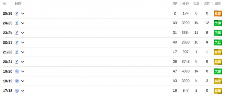在水晶宫的五个赛季中,埃泽的表现日益稳定,成为球队的进攻核心。水晶宫并非强队,主打快速反击,因此埃泽的数据虽不如“传统10号”亮眼,但近三个赛季他均能实现“10+5”以上的进球助攻数据,上赛季更是贡献14球11助。